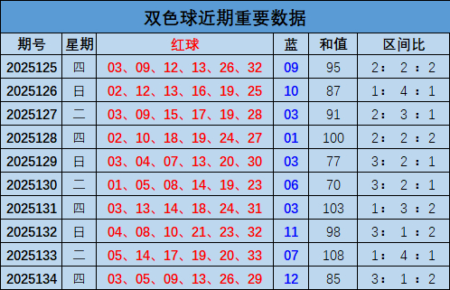 双色球上期开出奖号:03 05 09 13 26 29+12,和值85,区间比3:1:2